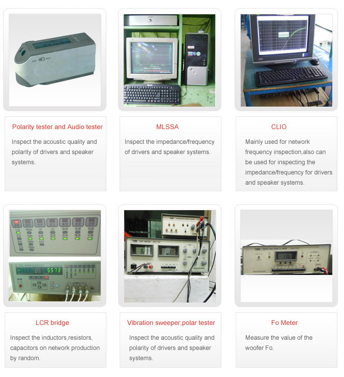 The testing equipments including audio sweeper,polar tester,Fo meter,MLSSA,CLIO,impedance meter,etc...